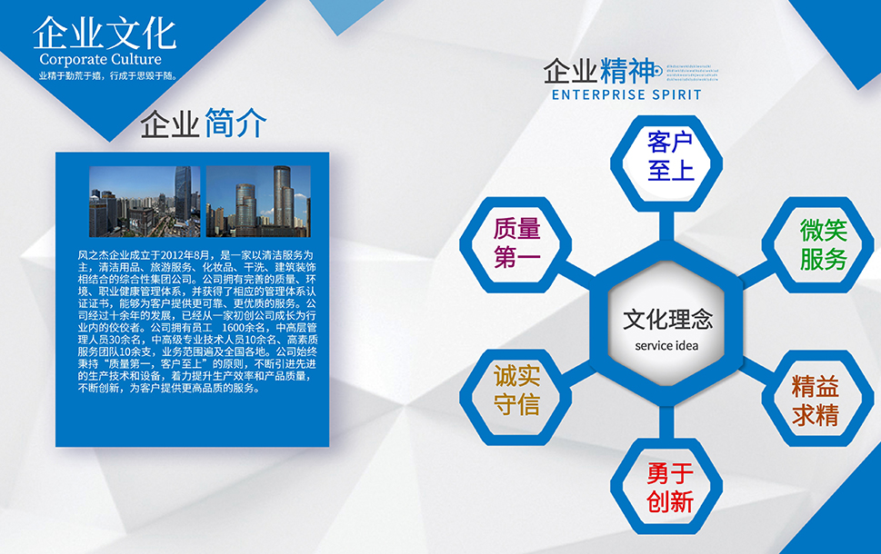 公司是一家以清潔服務為主,旅游,干洗、化妝品、裝修和餐飲相結合的多元化發(fā)展運營的服務性企業(yè)。企業(yè)本著誠信第一、服務至上的原則,依靠公司盡我所能、力我所及的信條從2012年到現(xiàn)在服務了多家企業(yè),現(xiàn)在我們已經(jīng)擁有了400家左右的清潔服務項目和多家洗衣店。我們會一直牢記服務,創(chuàng)新才是我們企業(yè)發(fā)展的服務宗旨。